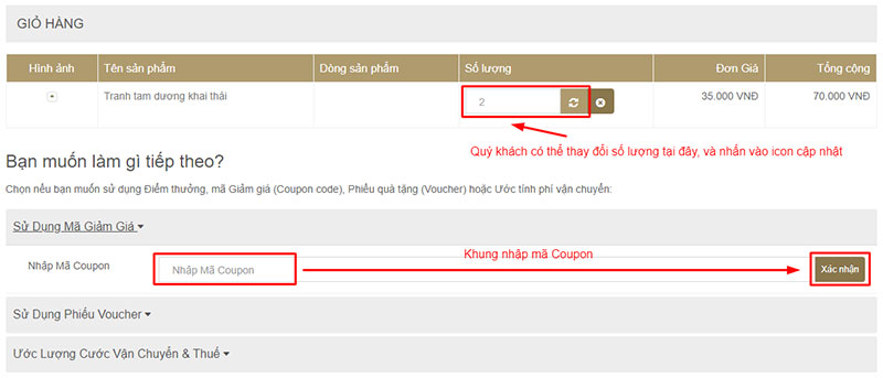 → Bước 6: Tại trang giỏ hàng , quý khách có thể điều chỉnh số lượng sản phẩm, thêm mã coupon, voucher nếu có cũng như phí vận chuyển ,…