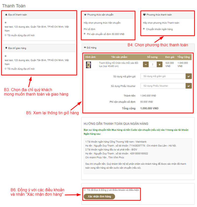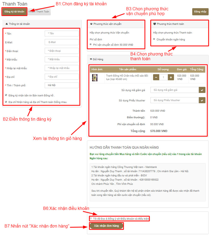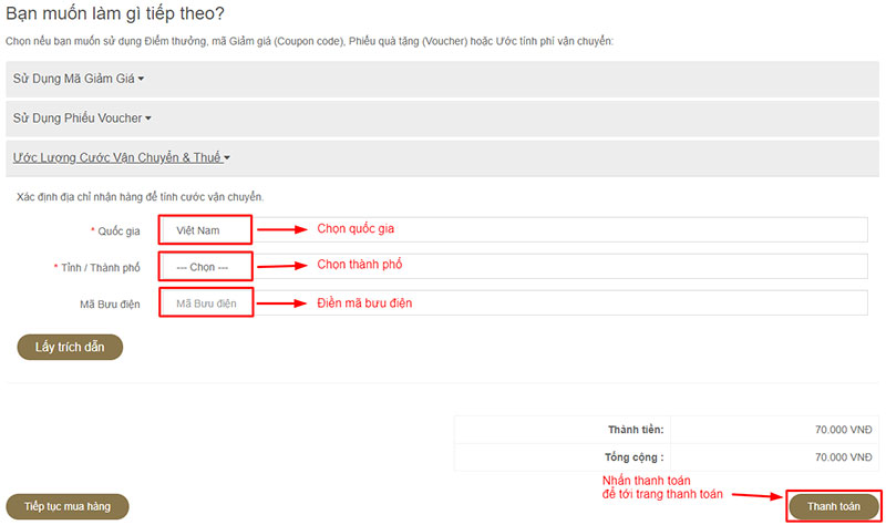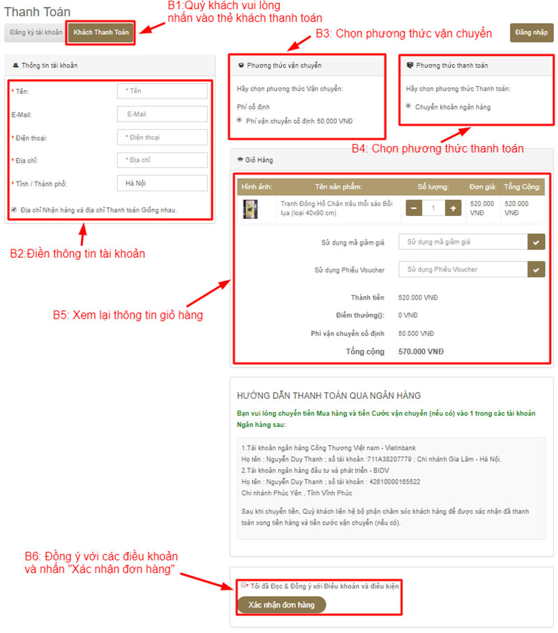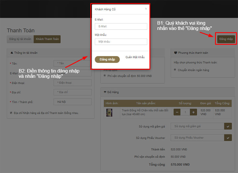 Khi quý khách đã có tài khoản tại trang web của chúng tôi, tại trang thanh toán quý khách có thể dễ dàng thanh toán theo các bước sau: