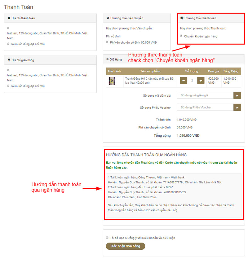 Khi nhấn chọn phương thức thanh toán này, quý khách vui lòng xem thông tin tài khoản ngân hàng bên dưới vài thực hiện giao dịch tại ngân hàng. Ví dụ vị trí tài khoản ngân hàng và thực hiện giao dịch tại ngân hàng.